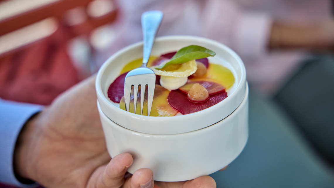 On board the Gallia, you’re treated not only to breathtaking views, but also to a menu that celebrates the flavours of the region at the highest level. With great care and creativity, our kitchen team crafts a refined 5-course menu each day using fresh, seasonal ingredients. Vegetarian, vegan, or allergen-free options are available upon request. Three of the courses are served wherever you feel most comfortable – always accompanied by our attentive crew and a carefully curated selection of beverages included in the experience.